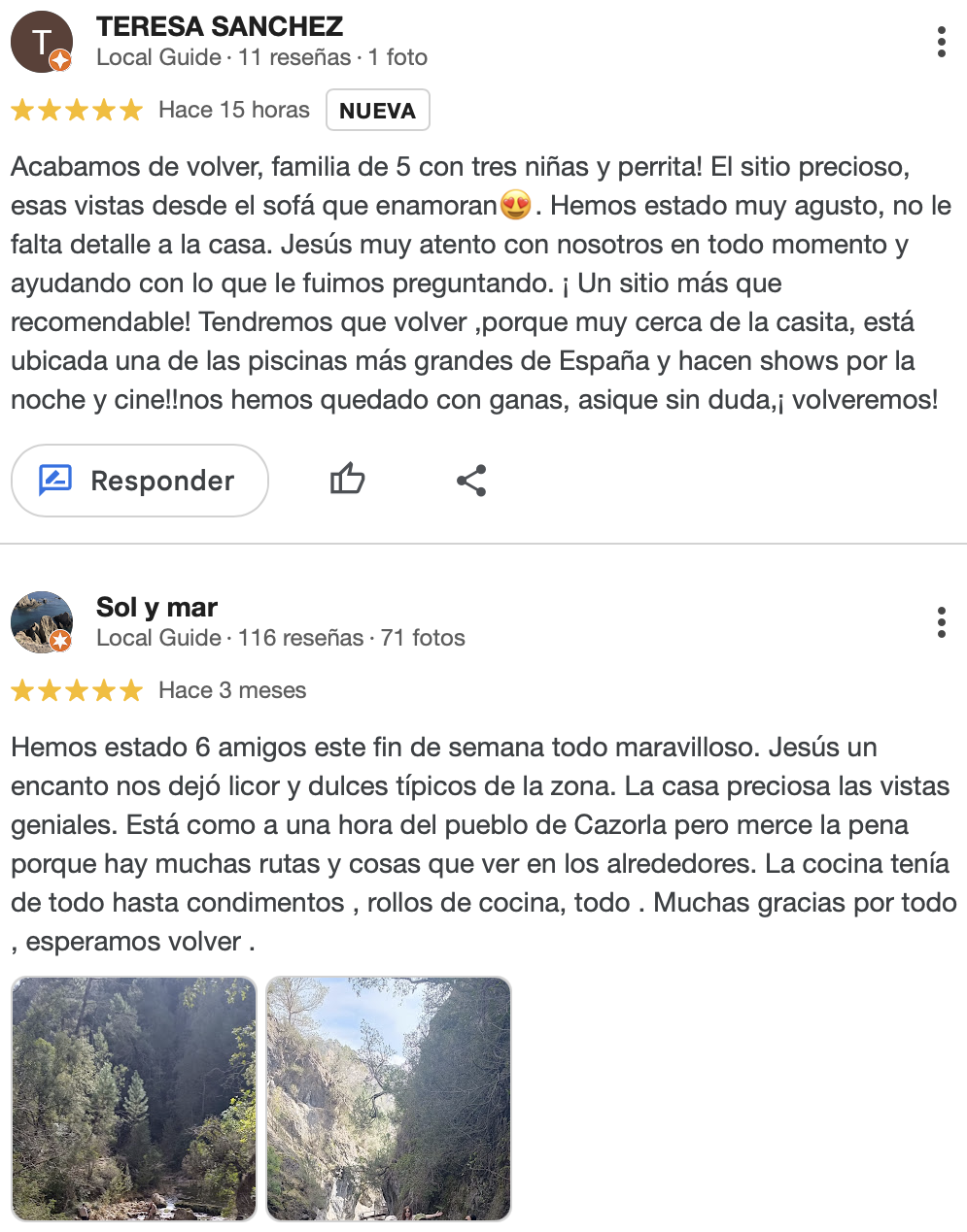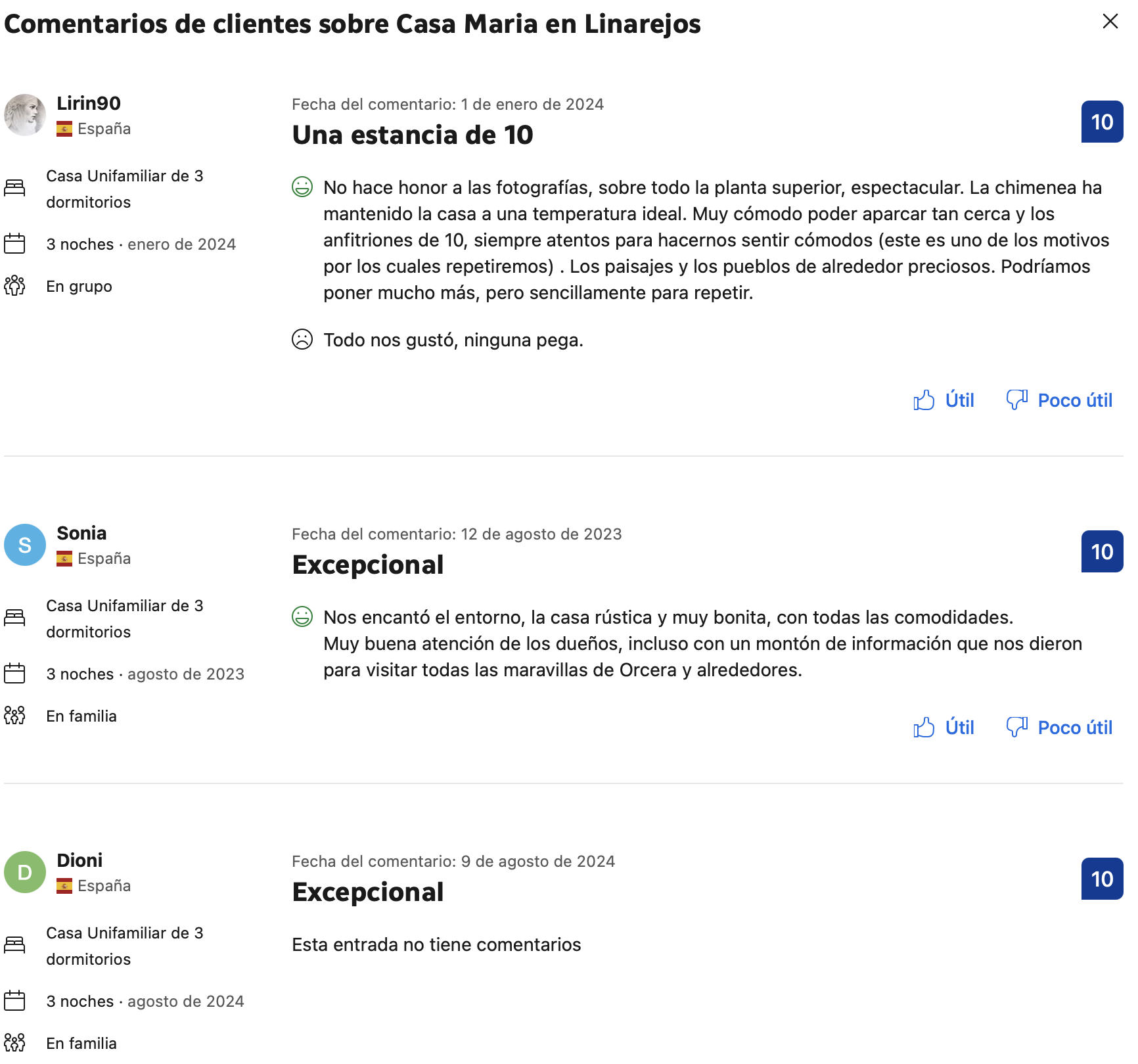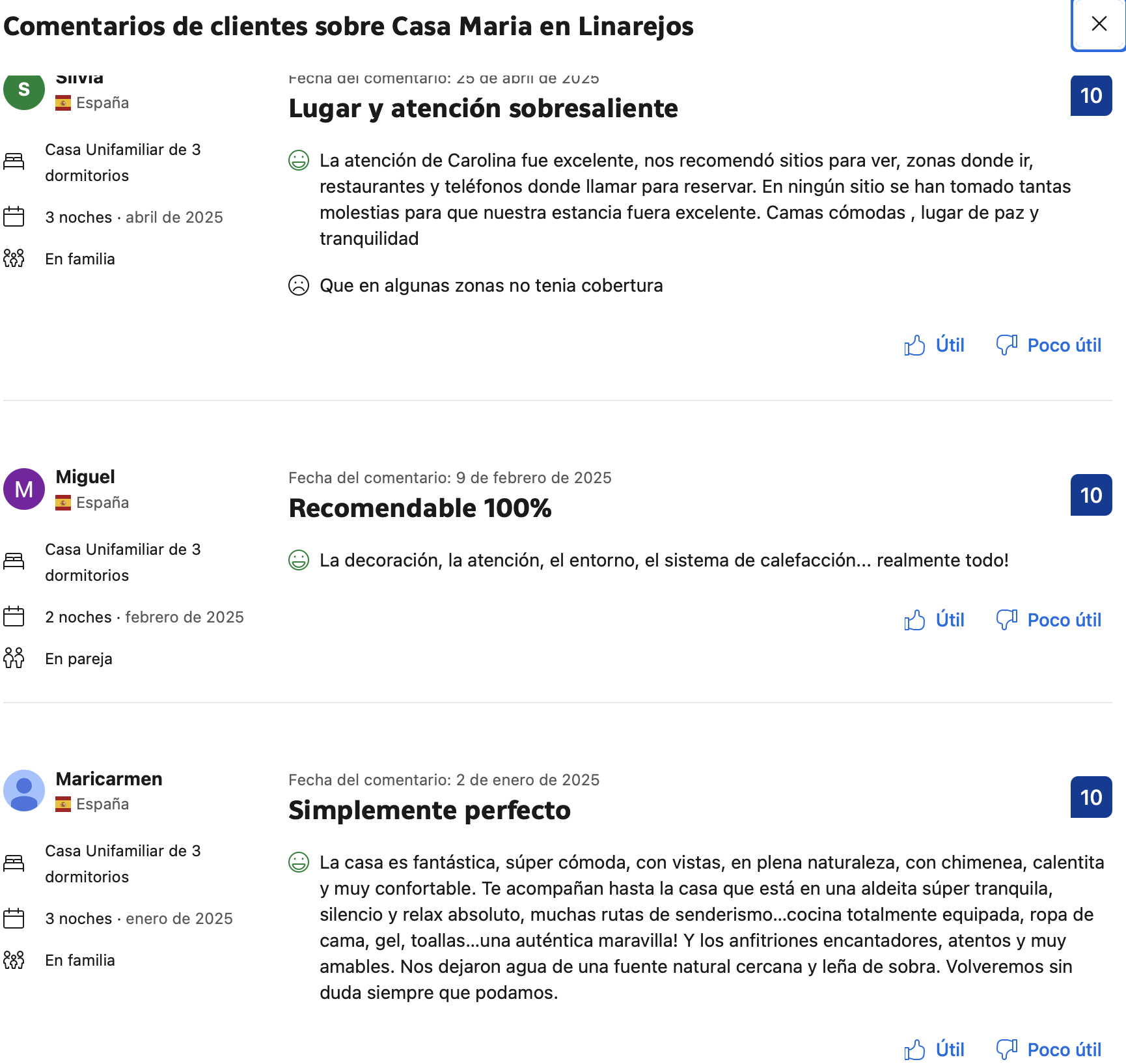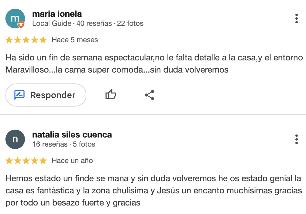 Estas son algunas de las valoraciones reales de personas que eligieron Casa María para su escapada rural: